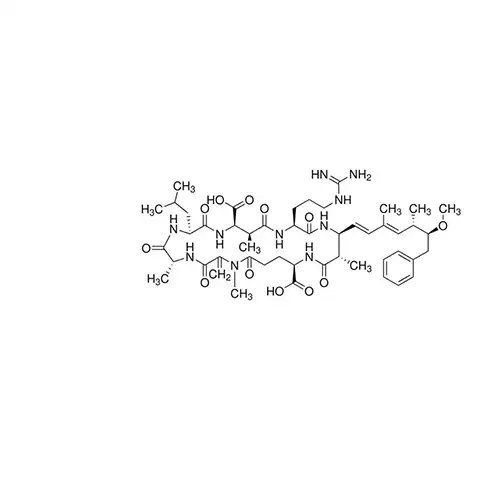 Microcystin-LR belongs to the group of cyclic heptapeptide metabolites called microcystins, produced by cyanobacterium (blue-green algae) Microcystis aeruginosa, and others.